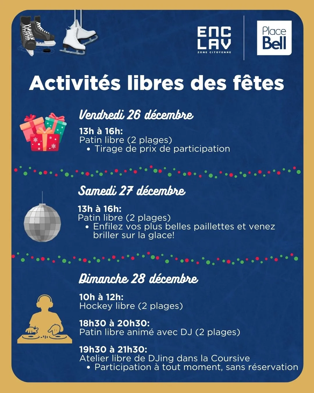 • la location de patins et casques est disponible sur place (aides à patiner sans frais)