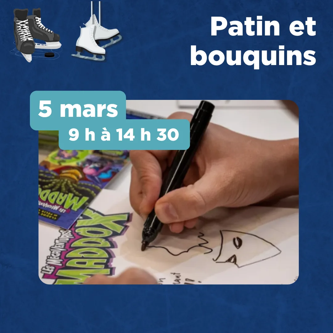 En plus de ta séance de patin libre, réserve ta place pour un atelier de dessin avec nul autre que les auteurs des BD de la série Maddox! En prime, les bibliothèques de Laval seront sur place avec une panoplie de livres à consulter et emprunter dans la coursive.